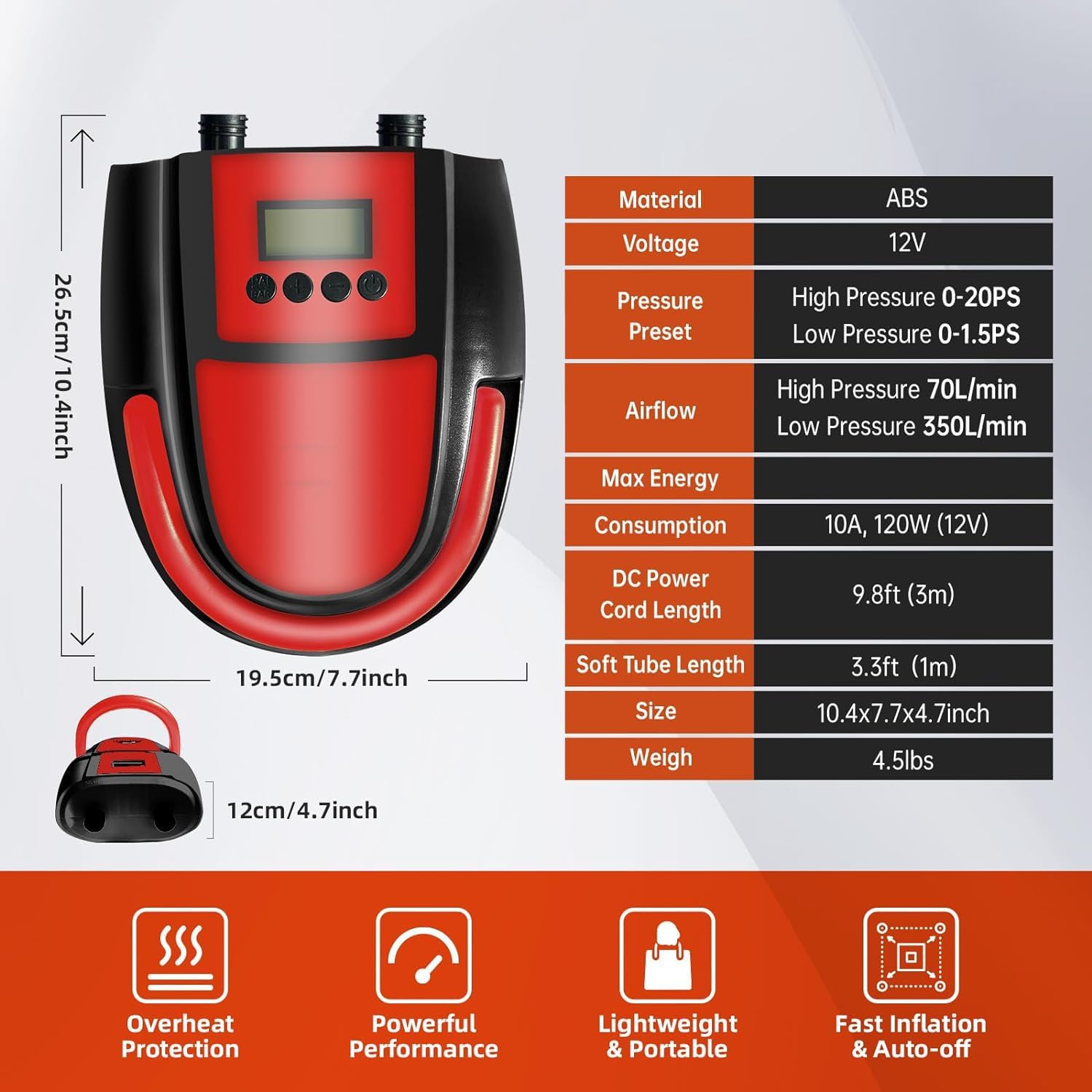 Portable Dual-Stage Electric Air Pump – 20 PSI Max, Quick Inflation for Paddle Boards, Boats & Inflatables (Random Colour)